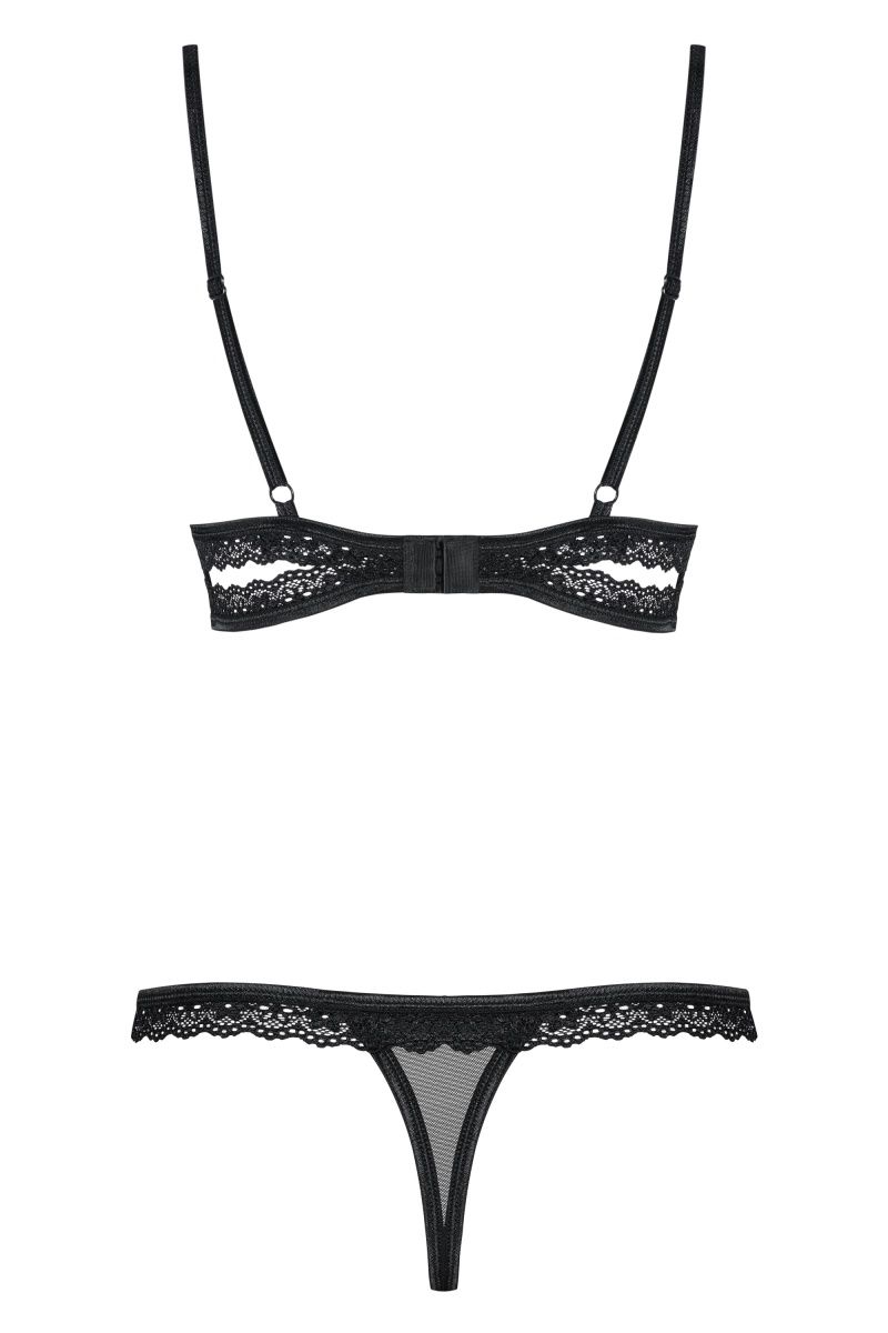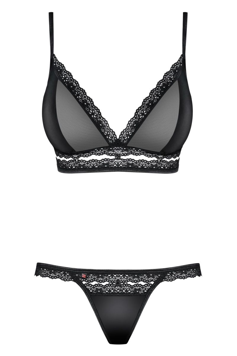 Кружевной комплект белья со вставками атласной ткани, состоит из бюстгальтера и трусиков, бретели регулируются. В комплекте: бюстгальтер и трусики-стринги.