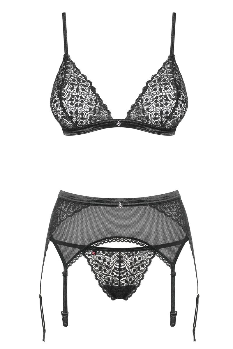 Кружевной комплект белья Shibu состоит из бюстгальтера, пояса для чулок и стринги. Лиф мягкий, без косточек, бретельки регулируются. Пояс для чулок с регулируемыми подвязками. В комплекте: бюстгальтер, трусики-стринги, пояс для чулок.