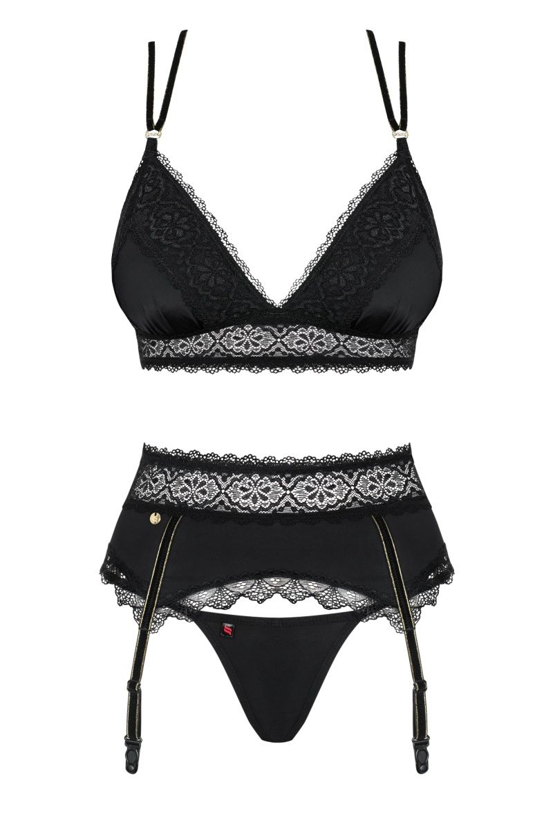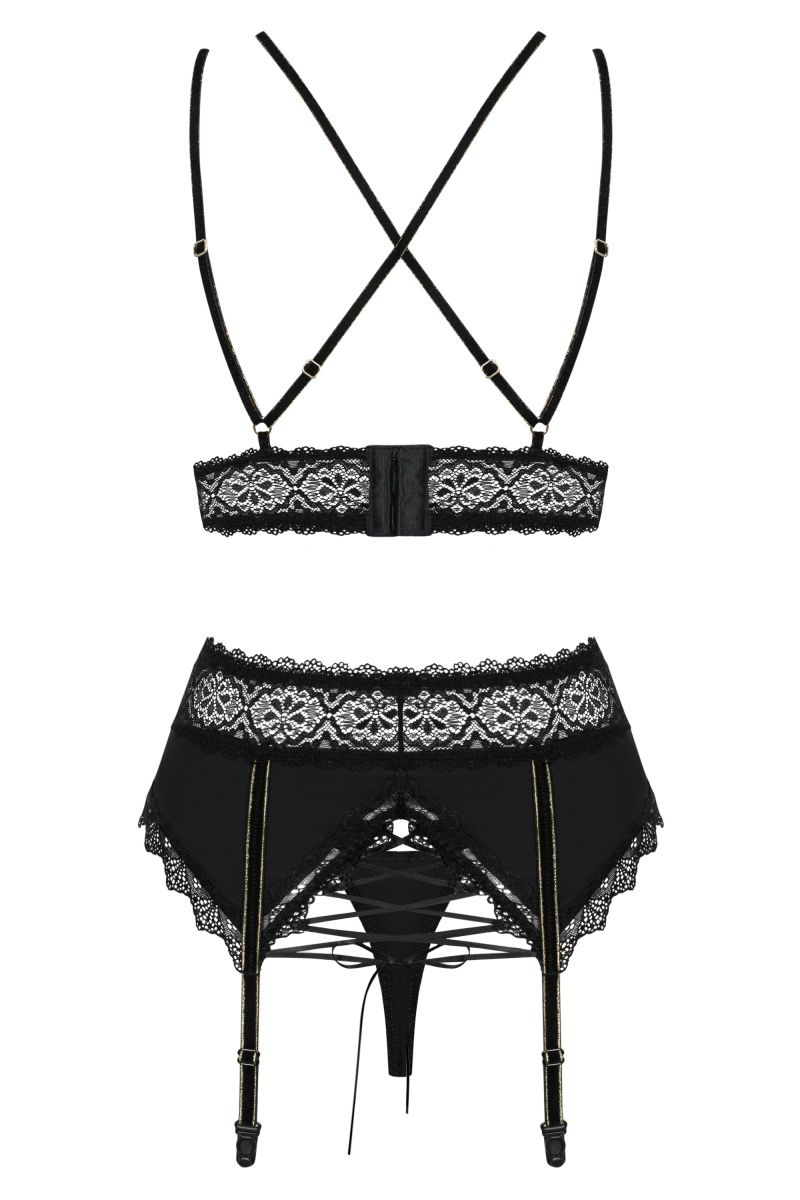 Эротический комплект белья Lolitte состоит из бюстгальтера, пояса и трусиков. Лиф без косточках с регулируемыми бретелями и застежкой на спинке. В комплекте: бюстгальтер, пояс, трусики-стринги.