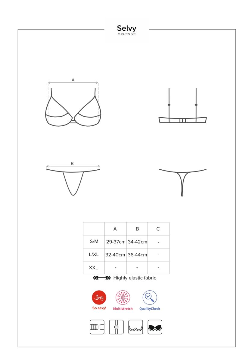 Комплект Selvy подчеркнет ваш горячий характер и раскроет дикость вашего сердца. Пряный открытый бюстгальтер с уникальным дизайном декольте придаст вам уверенности в себе и перенесет вас в самые грязные уголки вашего воображения! Не позволяйте ему отвести взгляд - наденьте соответствующие стринги в специальном дизайне. Это будет очень захватывающая ночь . В комплекте: бюстгальтер, трусики-стринги.