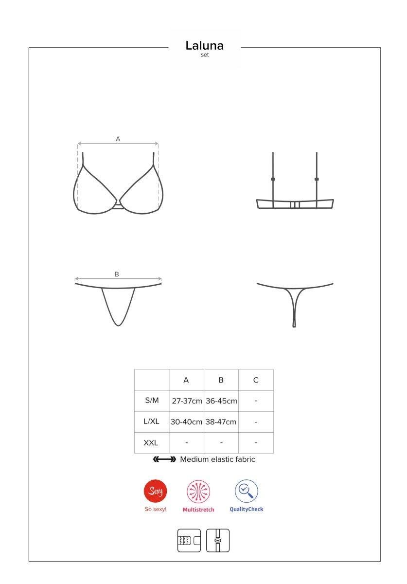 Роскошный комплект белья Laluna состоит из бюстгальтера и трусиков, выполнен из эластичной блестящей ткани и красивого кружева. Лиф мягкий без косточек, бретельки и застежка на спинке регулируются. Трусики сзади украшены пикантными вырезами. В комплекте: бюстгальтер и трусики.