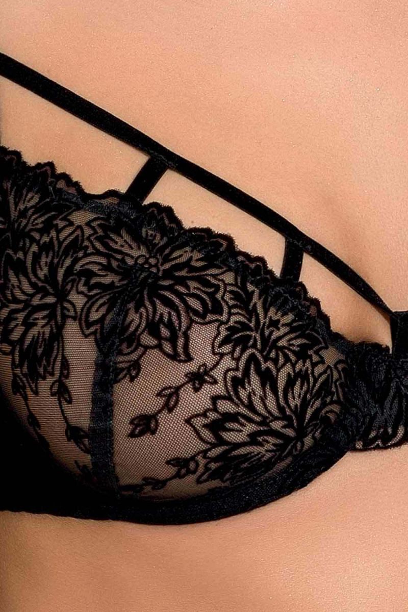 Сексуальный комплект Haya с узором в виде цветов и веточек. В комплекте: бюстгальтер, трусики-стринги, пояс.