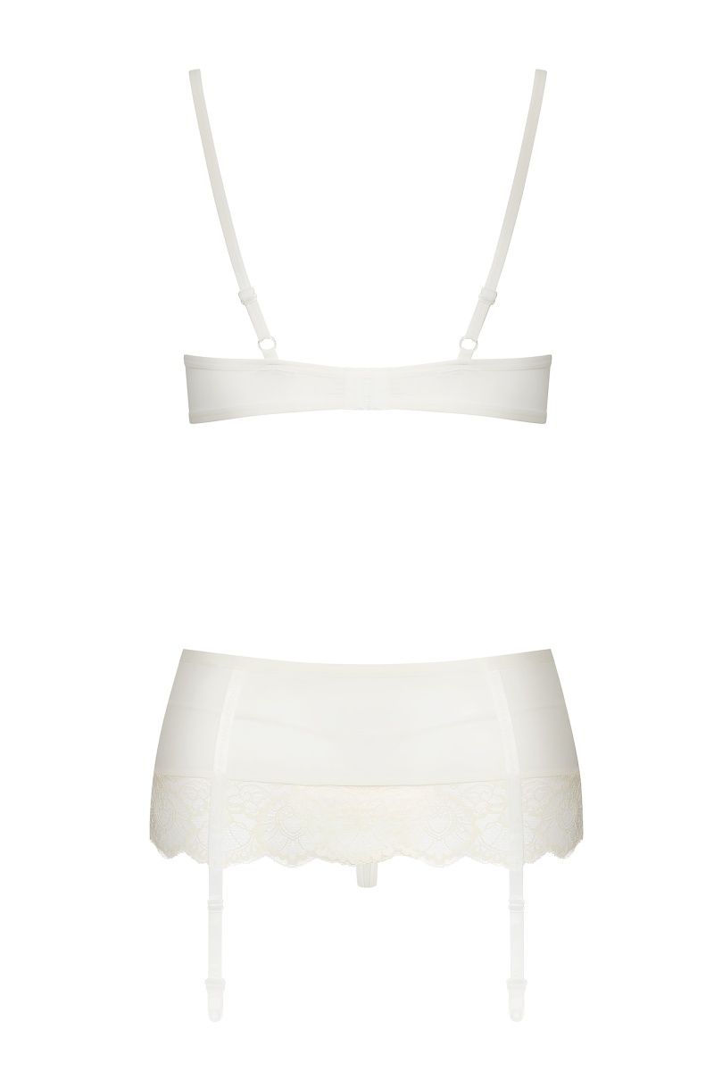 Полупрозрачный кружевной комплект выполнен из нежной ткани. Бюстгальтер с мягкой чашечкой на косточках в сочетании с трусиками дополнен широким роясом для чулок. В комплекте: бюстгальтер, пояс для чулок и трусики-стринги.