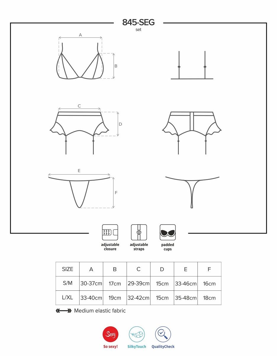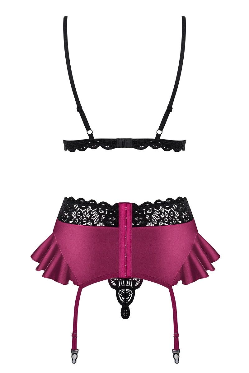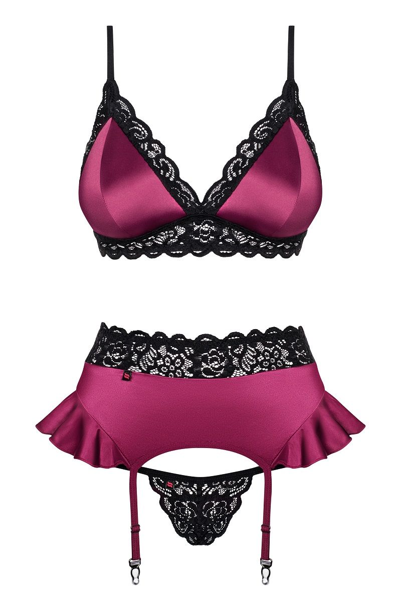 Яркий комплект из 3 предметов с отделкой кружевом. В комплекте: лиф, трусики-стринги, пояс.