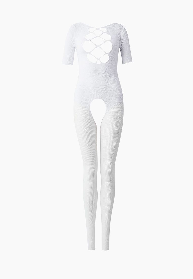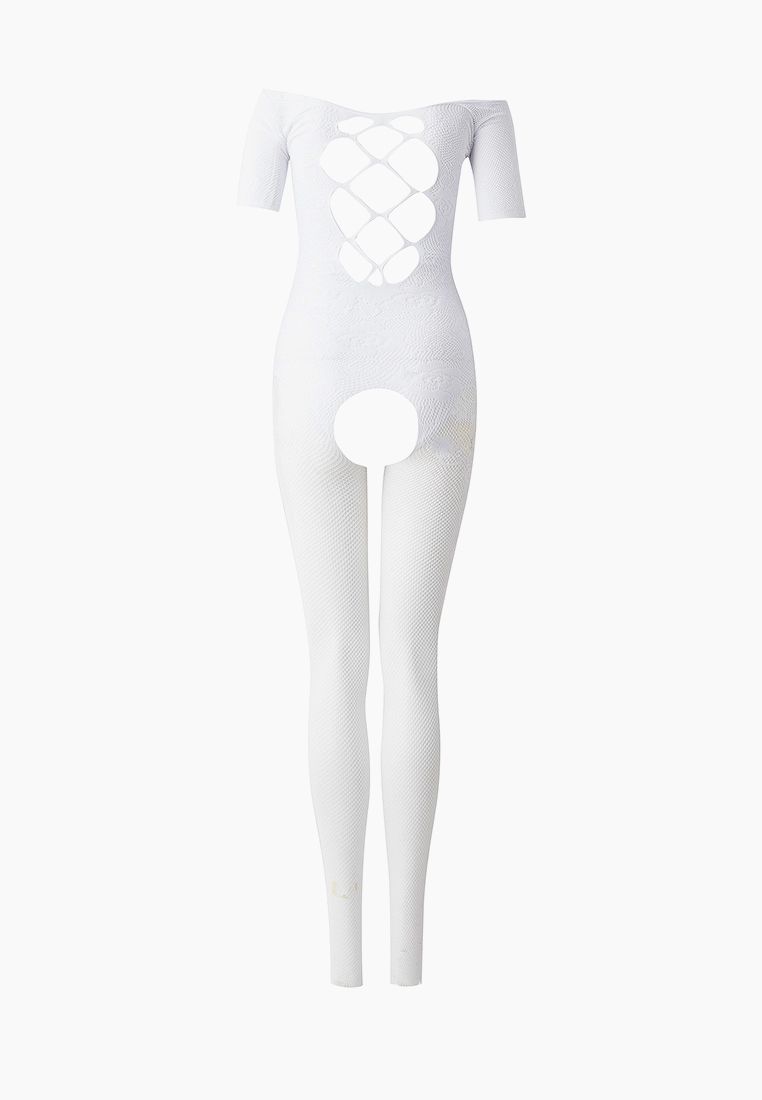 Белый комбинезон c короткими рукавами и имитацией шнуровки на груди. С интимным доступом. Трусики не входят в комплект!