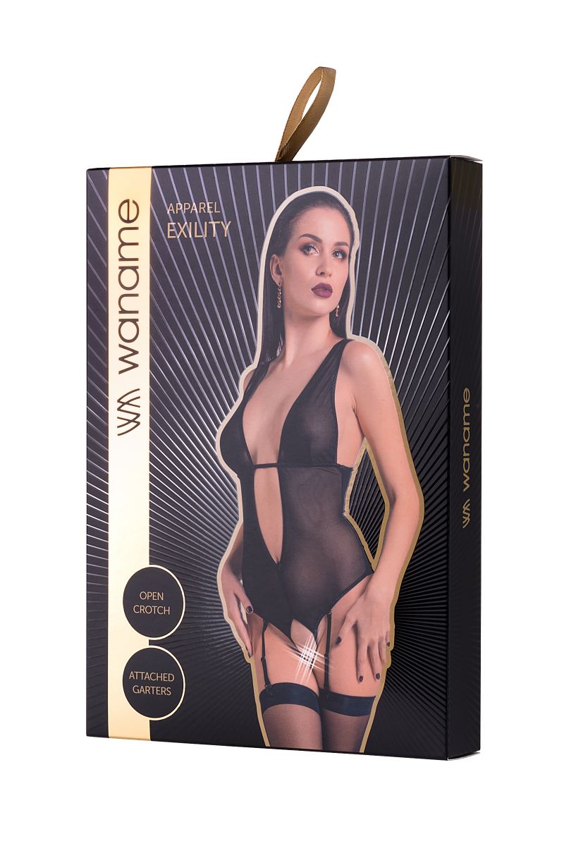 Эротическое боди с глубоким декольте и пажами для чулок «Экзи́лити» (англ. Exility — «Утонченность») из тонкой прозрачной эластичной сетки эффектно облегает фигуру. Ощущается совсем невесомым, не сковывает движений, но визуально меняет силуэт. Шелковистая поверхность материала дарит приятные ощущения при прикосновении. А современные элементы дизайна боди тешат женское самолюбие. Глубокое декольте акцентирует внимание на нежной коже бюста и дополняет образ вертикальными линиями. Выточки в районе груди, горизонтальная отделка и регулируемые бретели обеспечивают идеальную посадку. Пажи спереди и сзади легко отстегиваются и дают возможность изменить свой образ в считанные секунды. Открытая спина, обширный эротический доступ — важные детали чувственного образа.