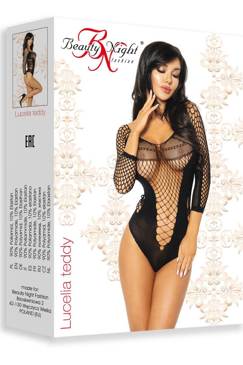 Невероятно соблазнительное боди Lucelia с открытой спинкой и длинным рукавом идеально облегает фигуру. Изюминкой этой модели является крупная сетка.