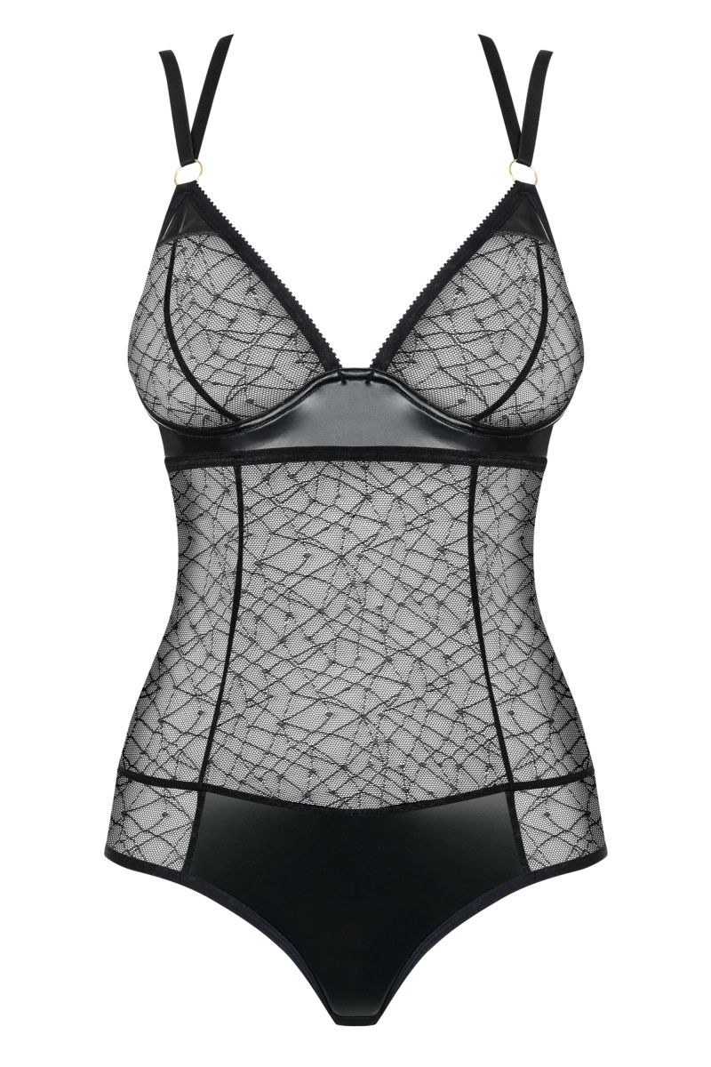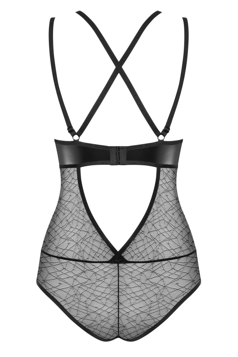 Боди из полупрозрачной сетки с декоративной вставкой из ткани с мокрым эффектом. Регулируемые бретели перекрещены на спине.