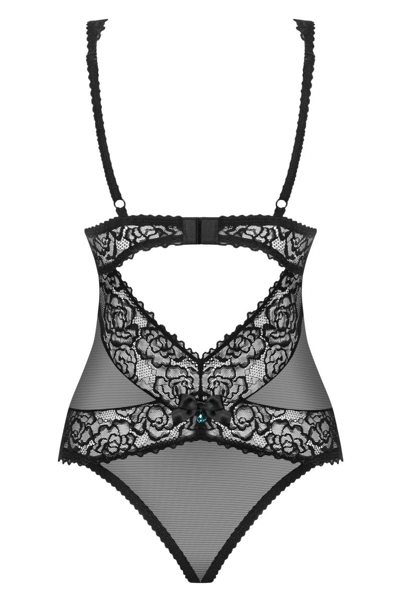 Полупрозрачное боди выполнено из эластичной сеточки в сочетании с красивым кружевом. Боди с чашкой на косточках, на спинке регулируемая застежка.