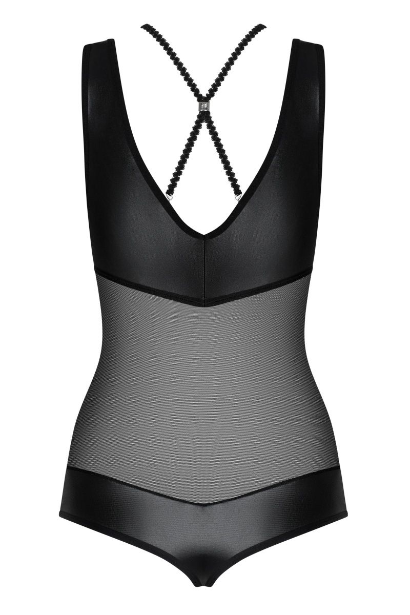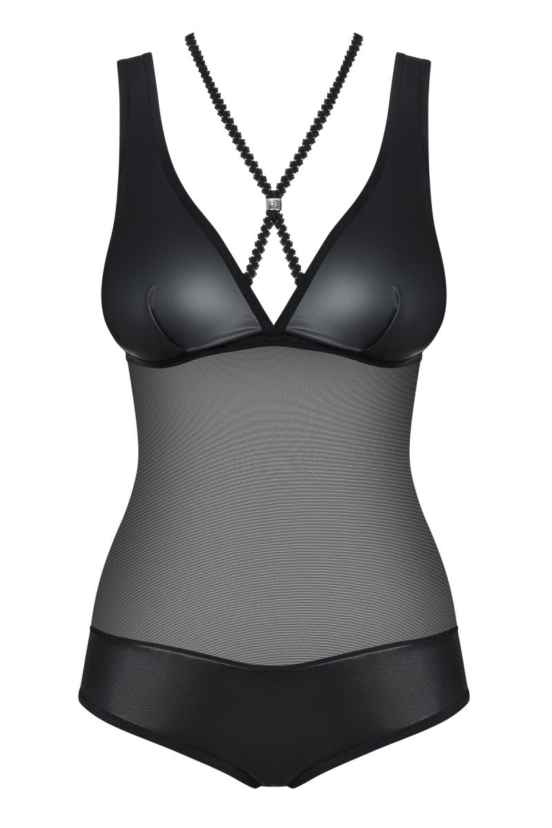 Соблазнительное боди Leatheria выполнено из эластичной эко-кожи и полупрозрачного тюля. Лиф мягкий без косточек, широкие бретели не регулируются. На спинке и в области груди изделие декорировано мягкими лентами.