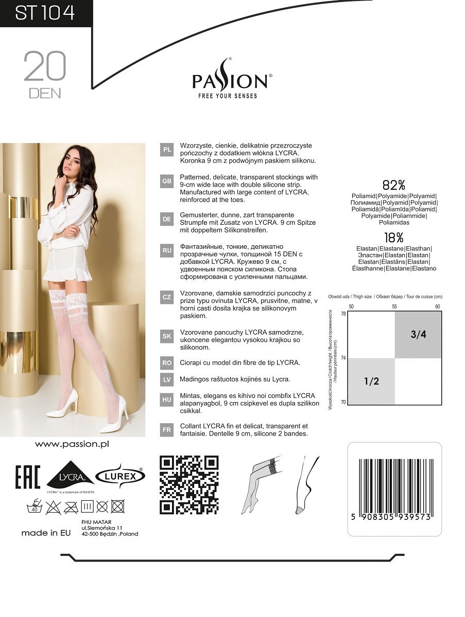 Чулки Passion станут элегантным дополнением к любому наряду, а в нужный момент подчеркнут страстность вашей натуры и помогут вскружить голову вашему кавалеру. Романтичный рисунок на резиночке и откровенные вырезы довершат ваш неповторимый образ. Продукт не вызывает аллергии, не красит, не пускает краску при стирке. Произведено на территории Европейского Союза. Продукт изготовлен из сертифицированных материалов наивысшего европейского качества. Плотность - 20 ден.