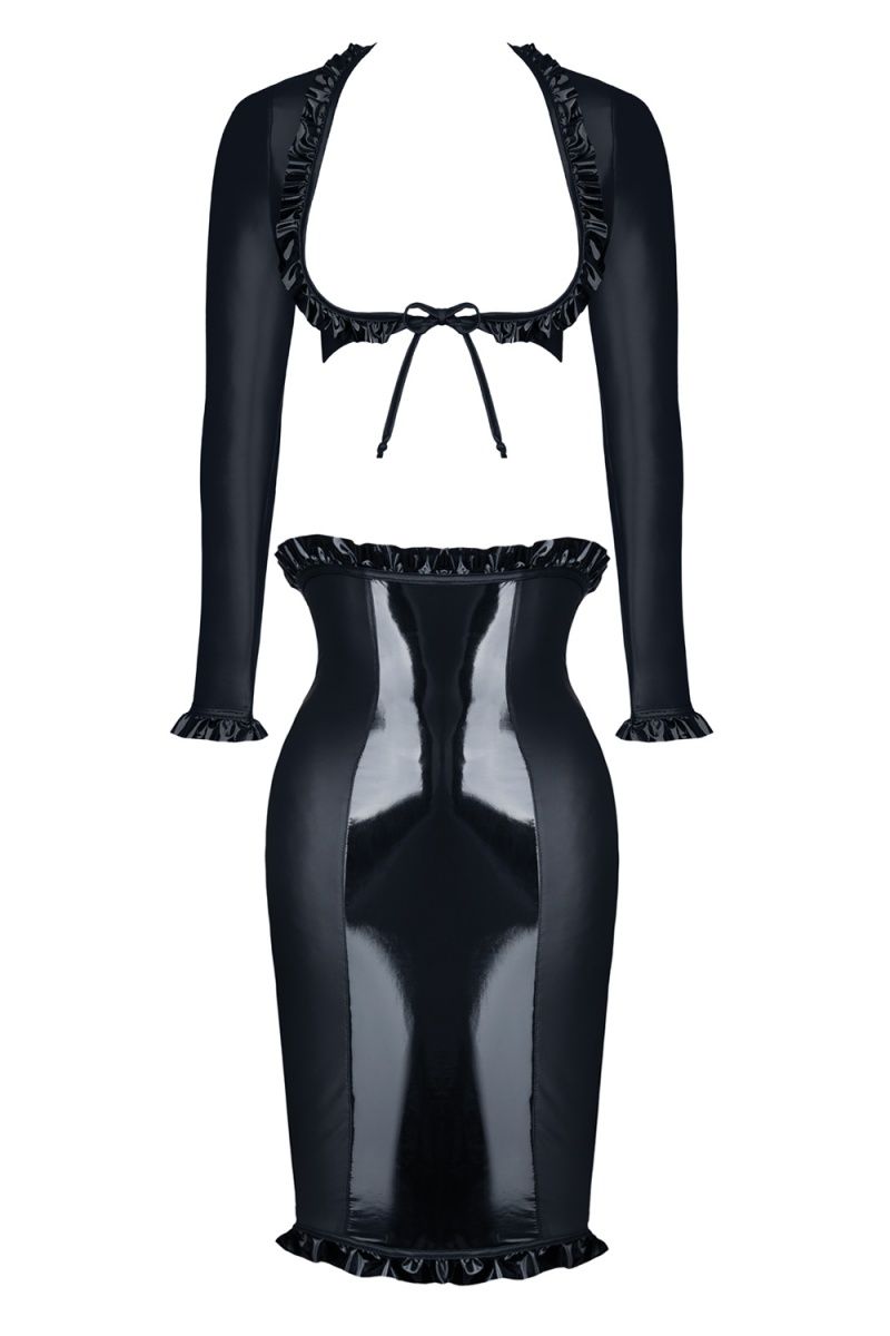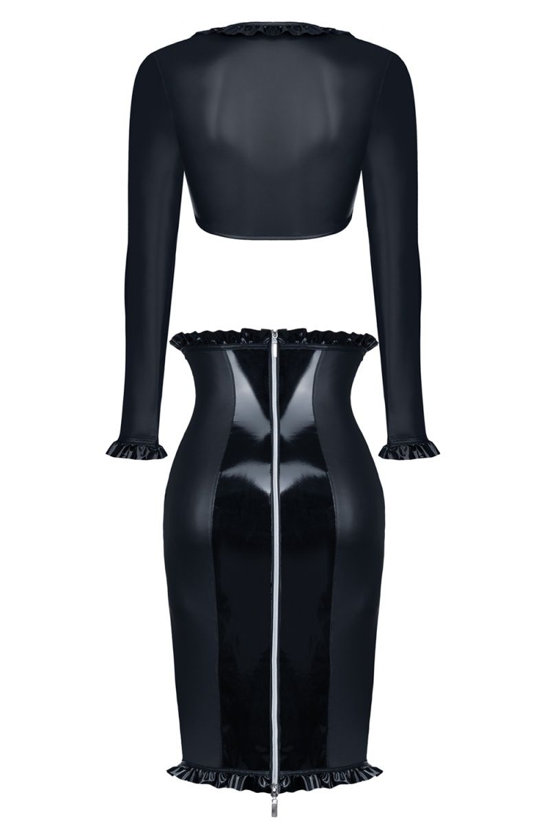Erna – это удовольствие и соблазнение в лучшем своем проявлении. Комплект состоит из длинной юбки с молнией сзади и болеро, эффектно подчеркивающим грудь благодаря окантовке из ткани с «мокрым» эффектом. Юбка полностью изготовлена из эластичного материала, что позволяет изящно подчеркнуть силуэт, а благодаря уникальному крою – визуально уменьшить талию. Но особое внимание нужно уделить застежке. Кроме того, что молния выполнена из металлического сплава и не окисляется при стирке, она добавит нотки пикантности и эротизма, так как вы сможете расстегнуть юбку не только вверх, но и вниз. В комплекте: юбка, болеро.