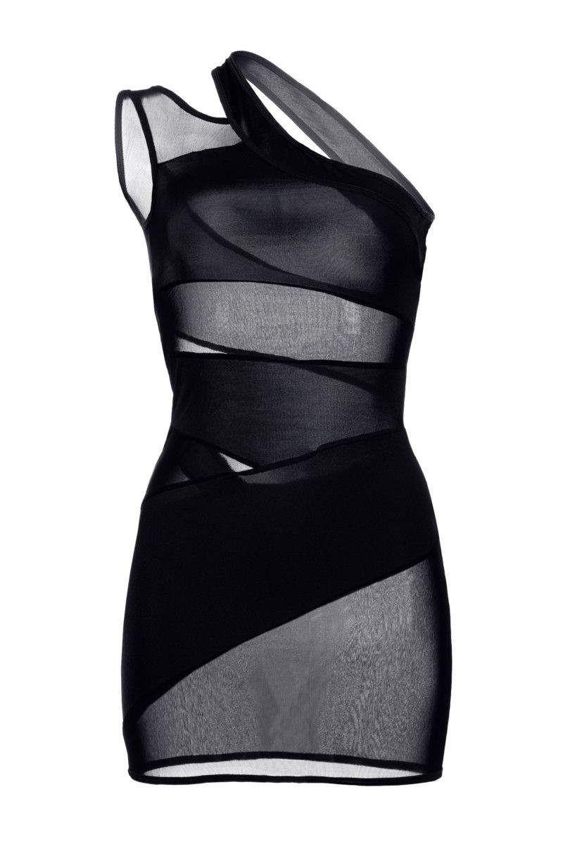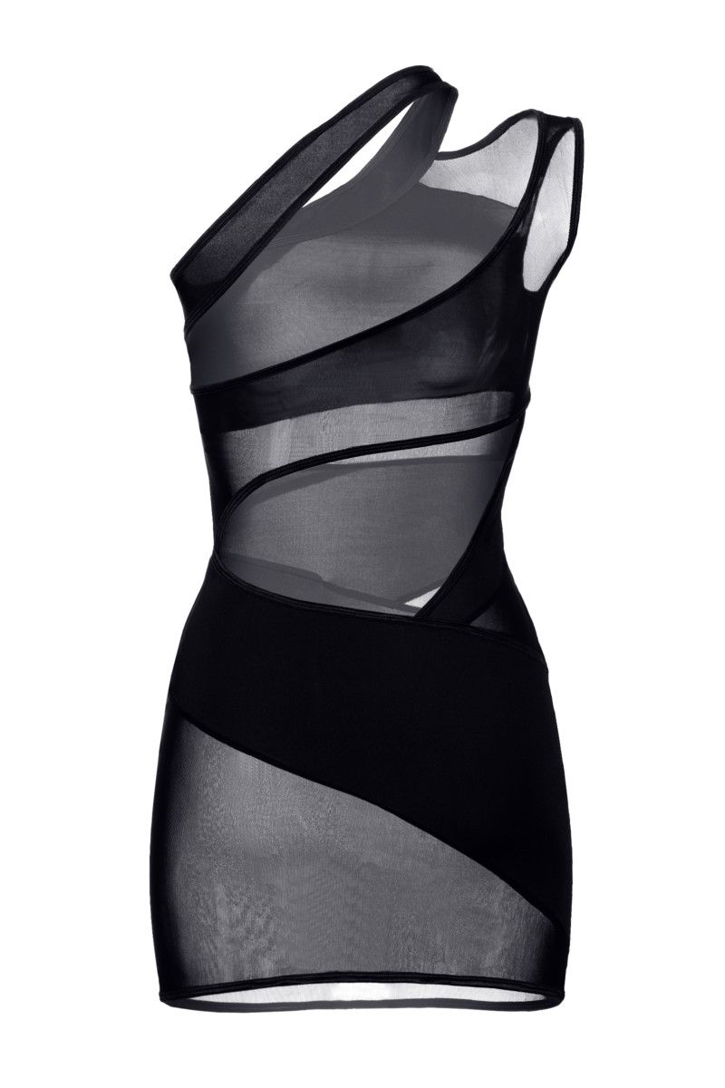 Платье с ассиметричными прозрачными вставками, с открытым плечом.