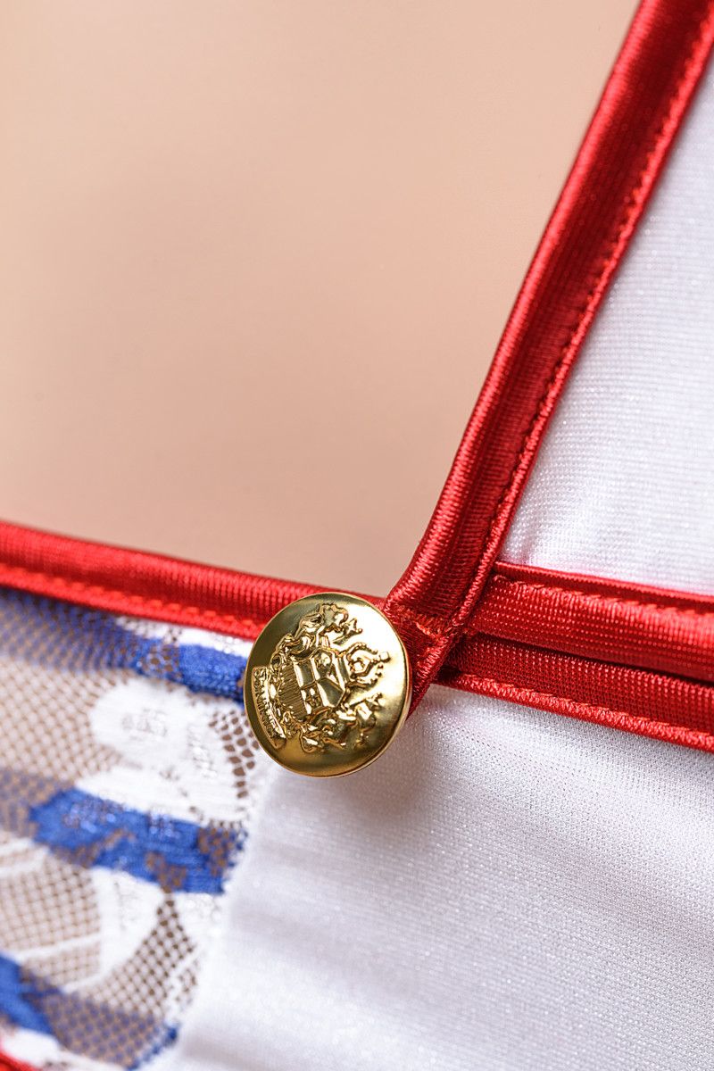 Костюм морячки из 2х предметов: боди-трансформера и головного убора. Внутренняя часть боди отстегивается и получается бикини. В комплекте: боди, головной убор.