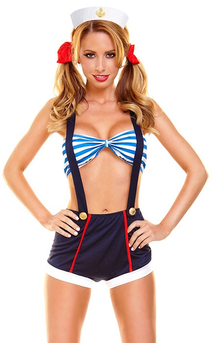 Маскарадный костюм морячки состоит из пяти предметов: лиф, фуражка, шорты с подтяжками и бантики. Лиф бандо в бело-голубую полоску. Белая фуражка с эмблемой. Темно-синие шорты с подтяжками. Два красных бантика. В комплекте: лиф, шорты, фуражка, 2 красных банта.