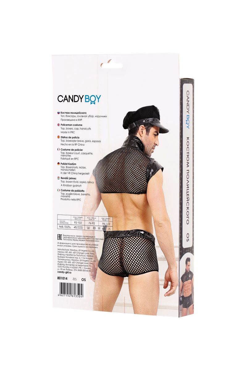 Стильный укороченный топ с отложным воротником легко расстегивается одним движением руки. Боксеры на широком эластичном поясе также дополнены провоцирующей молнией. Сочетание крупной сетки и материала wetlook выгодно подчеркивают достоинства фигуры. Пластиковые молнии без острых краев. Кепка с лаковым козырьком регулируется в обхвате. В комплекте: топ, трусы-боксеры, головной убор, 2 значка с надписью City Police и наручники.