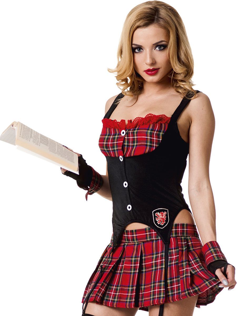 Любой мужчина, увидев эту прелестную школьницу, тут же захочет примерить на себя образ учителя или же строгого папочки. Красавица в облегающем топе и мини-юбочке в клетку заслуживает сурового наказания из-за двойки за контрольную работу. Дополнительные занятия после уроков один на один, пересдача, порка ремнём – каждый из этих сценариев сулит массу удовольствия вашей паре! Костюм состоит из: топа с подвязками для чулок, юбки, двух манжет.