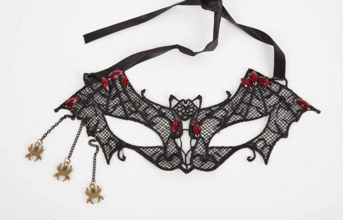 Кружевная маска в венецианском стиле в форме летучей мышки. Украшена красными стразами и железными паучками на цепочках. Завязывается на атласные ленты. Упаковка - бумажный пакет. Размеры - 21 х 9 см.