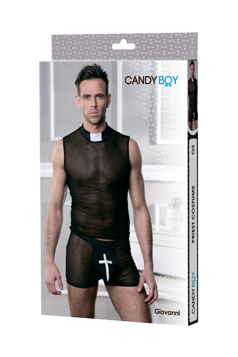 Костюм священника из 2х предметов: прозрачная майка с воротником-стойкой на застежке-липучке и трусы-шорты. В комплекте: майка, шорты.