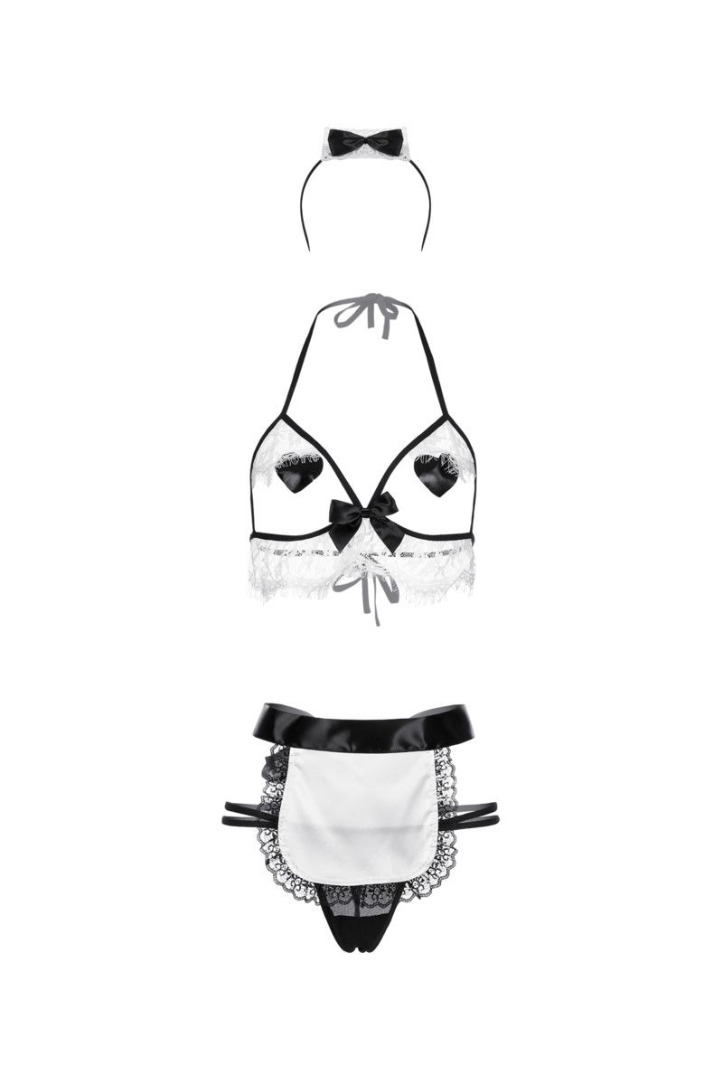Костюм раскрепощенной горничной Ciara украсит тело милыми фривольными акцентами, оставив вас в центре внимания. В комплекте: бюстгальтер, трусики-стринги, наклейки на грудь, фартук, головной убор.