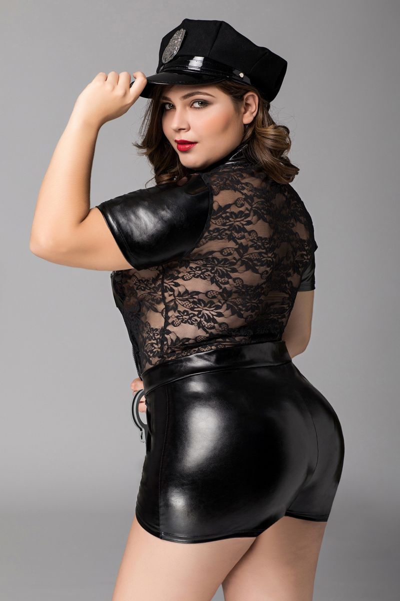 Комбинезон полицейского из беспроигрышного сочетания тканей: wetlook и прозрачного эластичного кружева, выгодно подчеркивает фигуру. Воротник-стойка, непрозрачные короткие рукава и кепка полицейского со значком добавляют образу строгости. Лаковые вставки прикрывают самые интимные места груди, акцентируют внимание на талии. Молния без острых краев. В комплекте: комбинезон, головной убор, наручники.