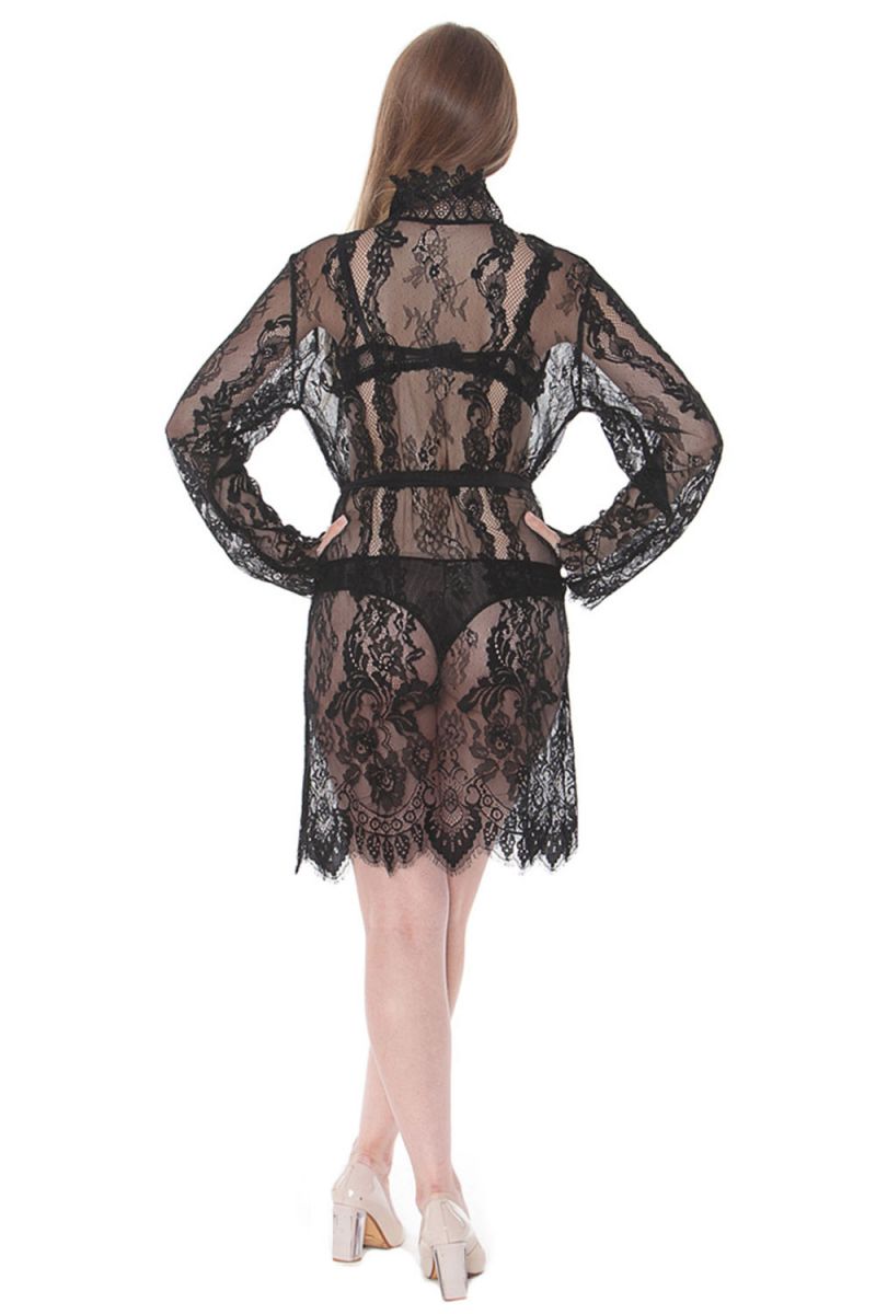 Женский халат выполнен из кружевного полотна. Модель свободного силуэта на поясе. Борта халата украшены кружевом. Рукав прямой длиной до запястья. Трусики и бюстгальтер не входят в комплект!