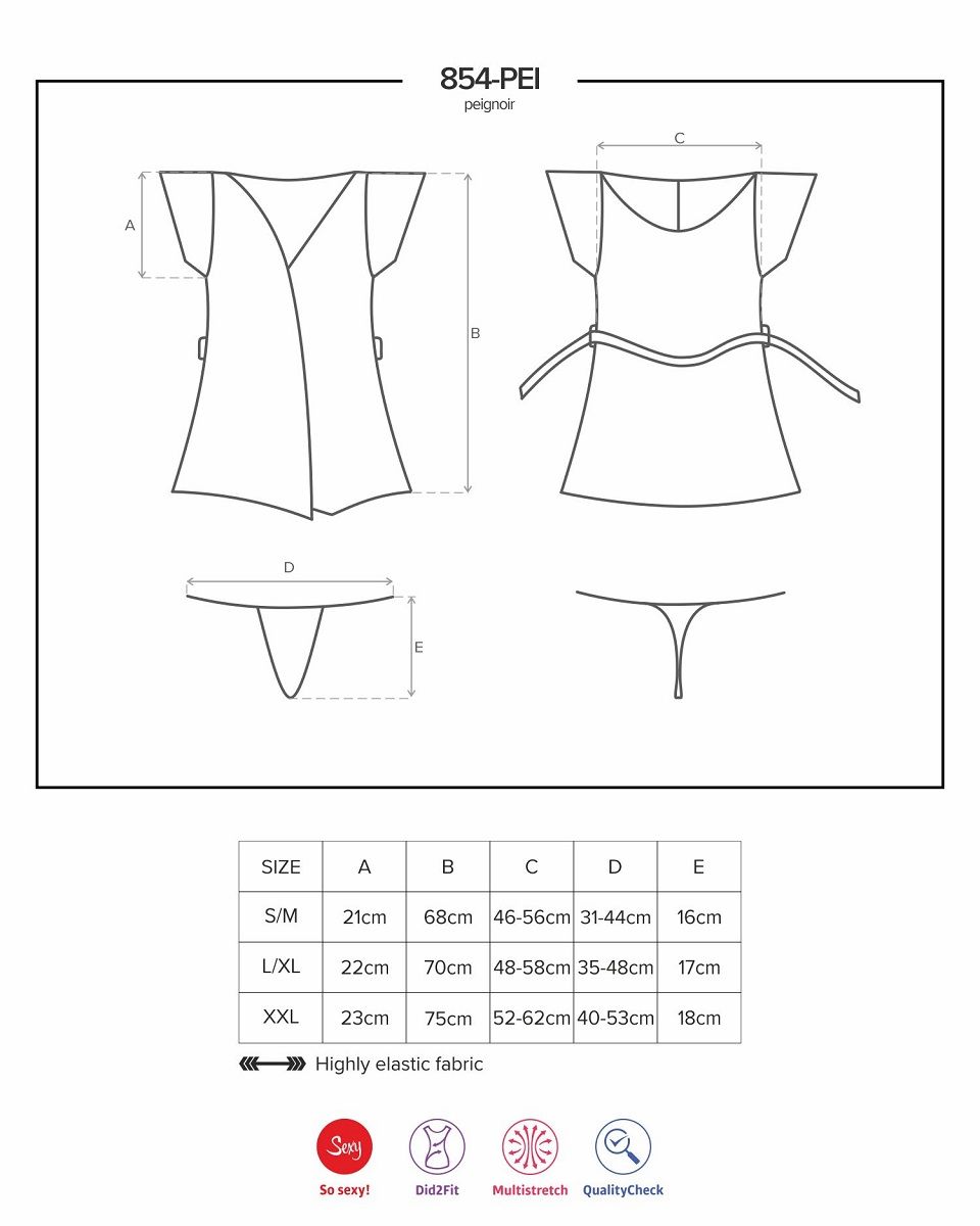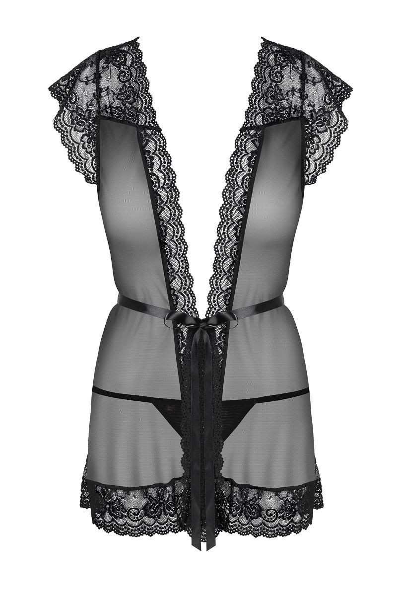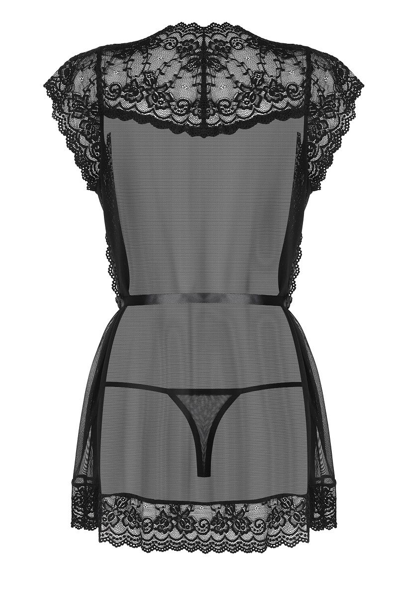 Коротенький пеньюар с атласным пояском и кружевами. В комплекте: пеньюар, трусики-стринги.