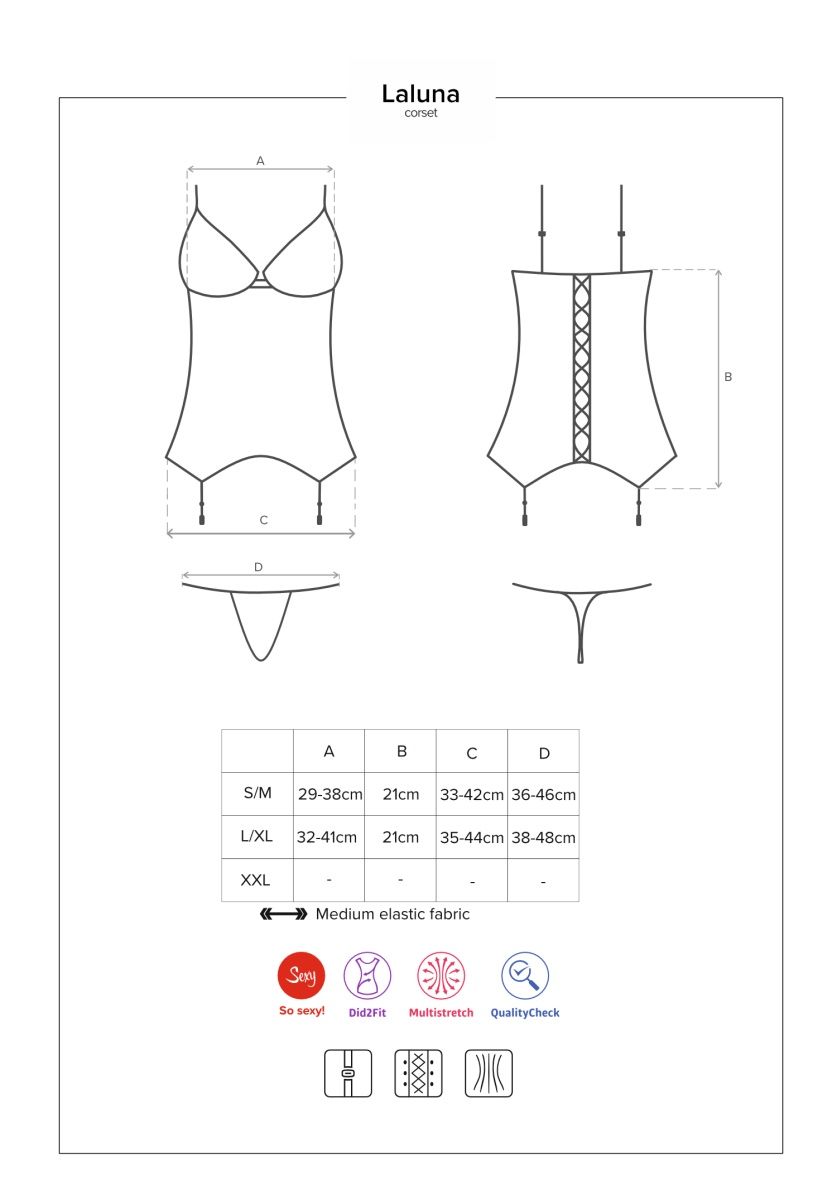 Роскошный корсаж Laluna с подвязками для чулок выполнен из эластичной блестящей ткани и красивого кружева. Лиф мягкий без косточек, бретели и подвязки регулируются по длине. На спинке очаровательная шнуровка. В комплекте: корсаж и трусики-стринги.