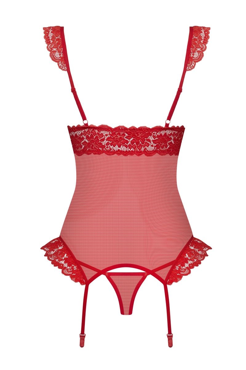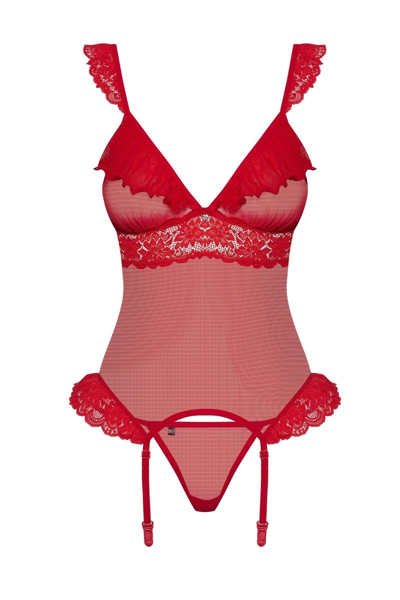 Возбуждающий корсаж с оборками на лифе. В комплекте: корсаж и трусики-стринги.