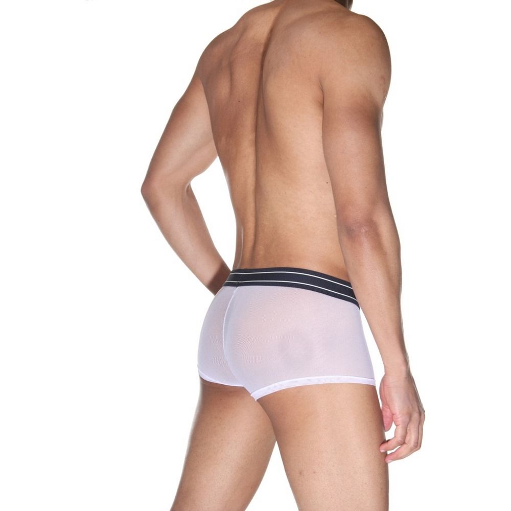 Боксеры для мужчин из белой полупрозрачной эластичной ткани, на широкой черной резинке с двумя белыми полосами.