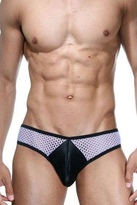 Мужские слипы с низкой посадкой, у которых задняя поверхность и боковые вставки сшиты из крупной сетки, гульфик из непрозрачной тянущейся ткани. Черным кантом обшита вся поверхность трусов.