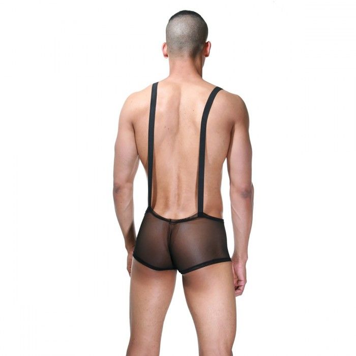 Мужское боди, представляющее собой трусы-боксеры из полупрозрачной черной ткани с нагрудником и лямками. Гульфик у трусов, нагрудник и лямки сшиты из непрозрачной, гладкой и эластичной блестящей ткани. Спереди на нагруднике светлый карман.