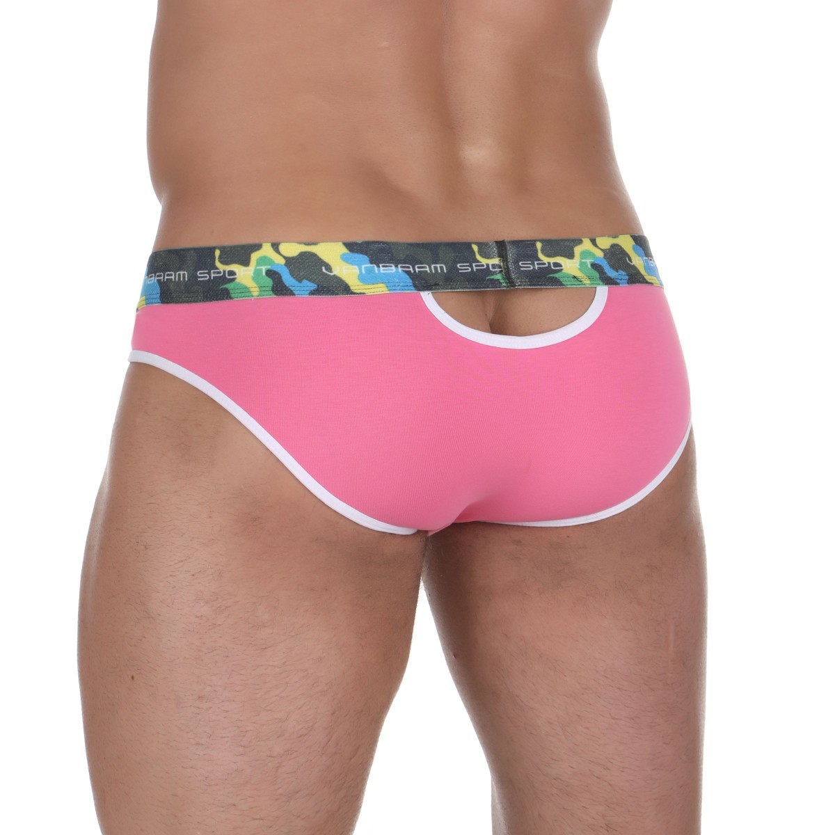 Розовые мужские трусы-слипы с пикантными вырезами под поясом.