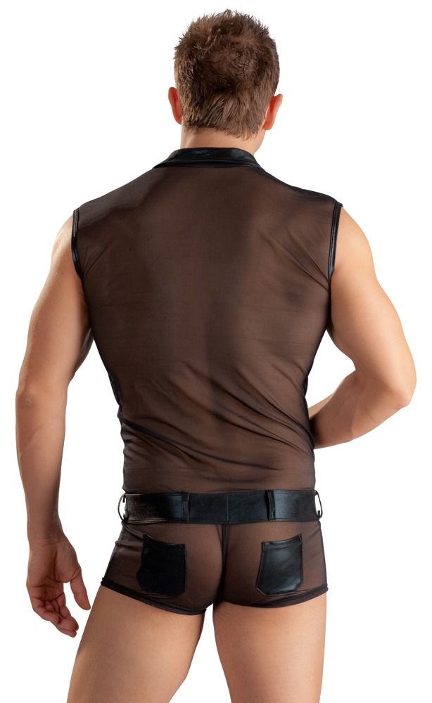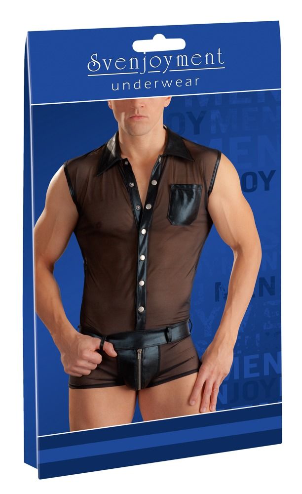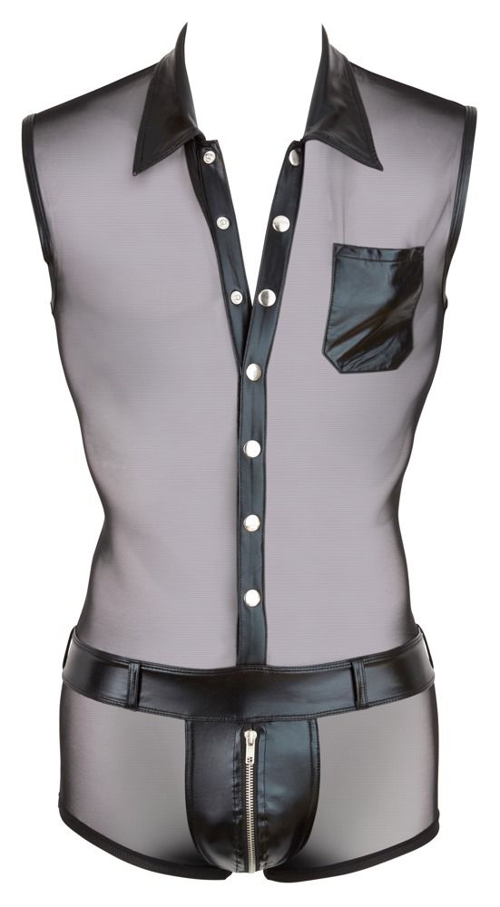 Сексуальный полупрозрачный комбинезон с кармашками. Ворот на кнопках. Имитация пояса. Молния на трусиках.