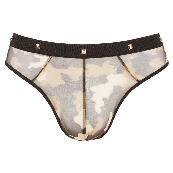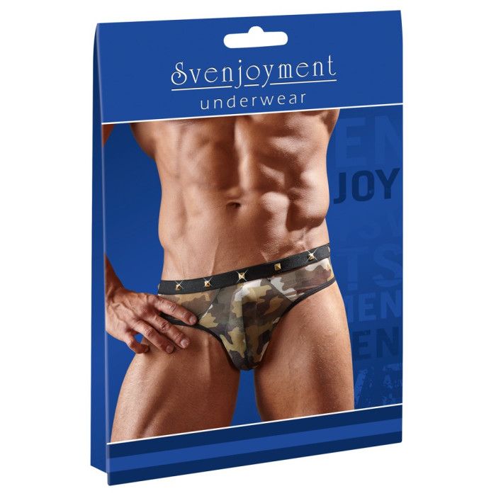 Трусы-стринги камуфляжной расцветки с квадропуклями на поясе.