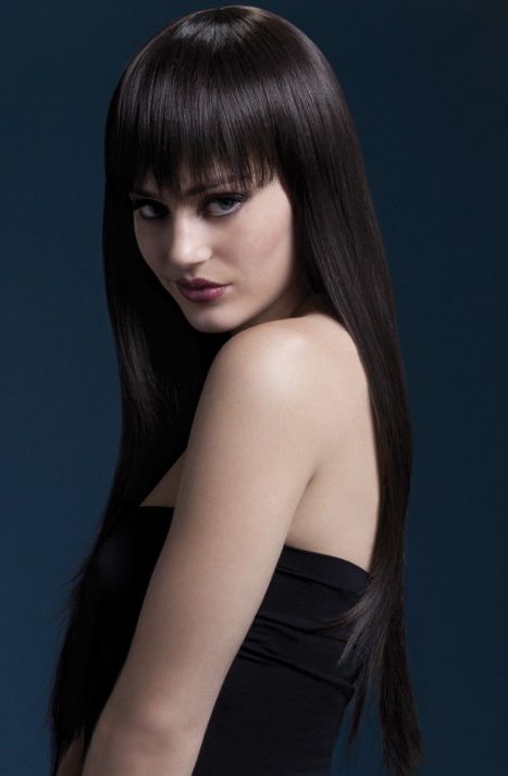 Каштановый парик с длинными прямыми волосами и челкой с рваным срезом.
