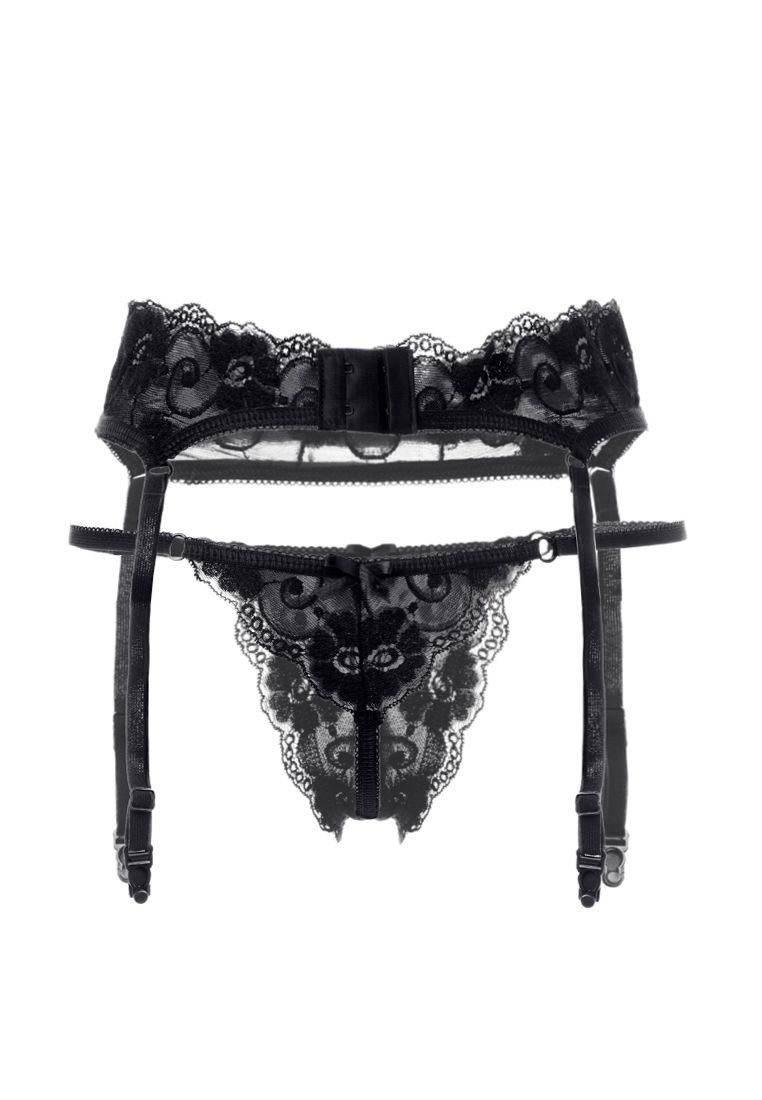 Чтобы выглядеть необычайно сексуальной, нужен лишь этот ажурный комплект, состоящий из пояса на застёжке и трусиков-стринг. Кружевной треугольник трусиков с рельефными краями и милым бантиком сверху прикроет зону бикини. Крупные цветы на пояске привлекут внимание к изгибам фигурки. Пажи на прозрачных колечках не дадут чулочкам (приобретаются отдельно) сползти в самый неподходящий момент. В комплекте: пояс, трусики-стринги.
