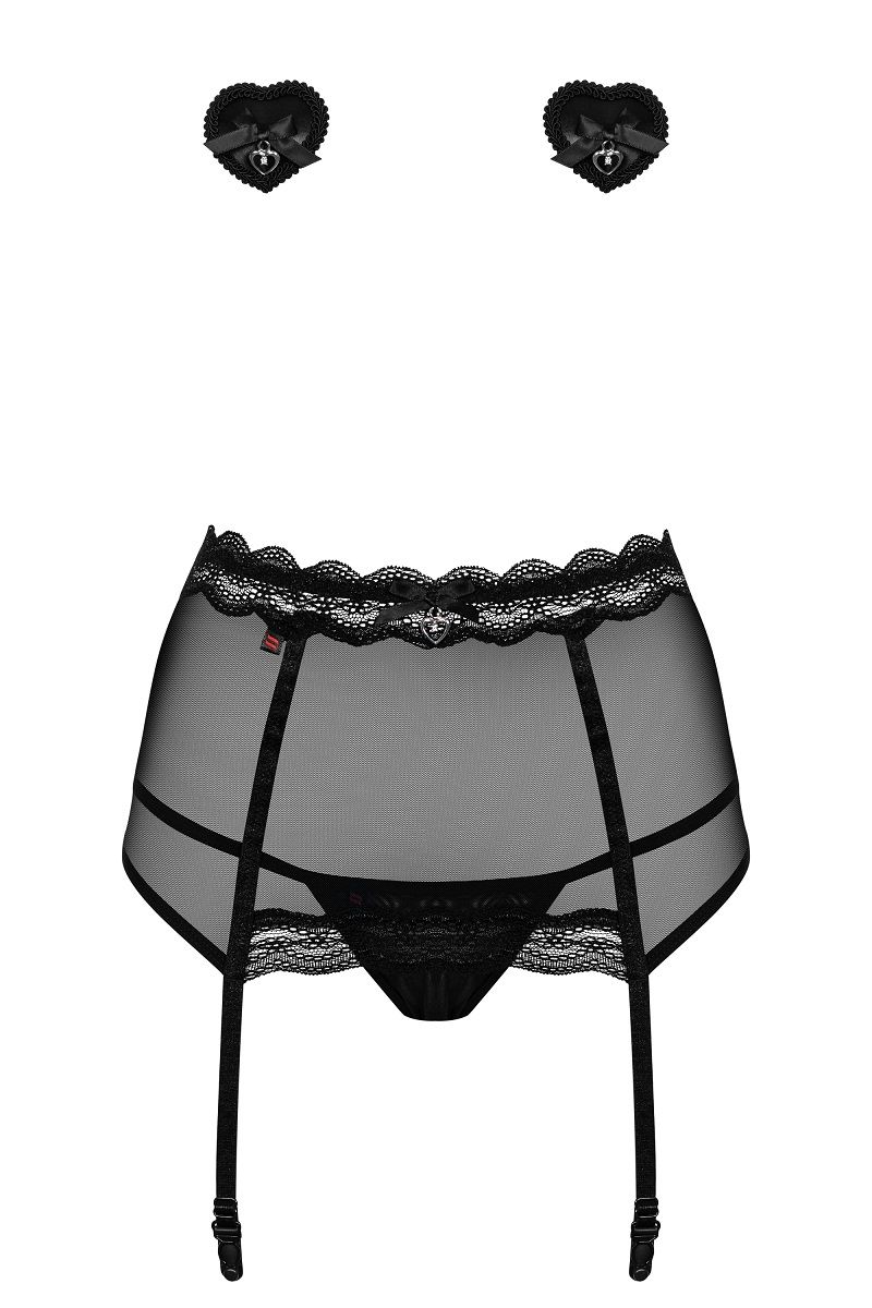 Комплект: широкий пояс для чулок, трусики и пэстисы. В комплекте: пояс, трусики-стринги, пэстисы.