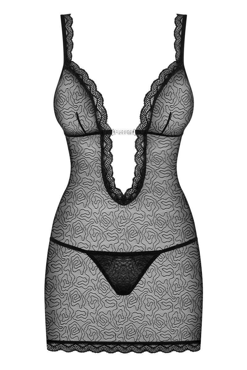 Полупрозрачная сорочка с рисунком с окантовкой из кружева. Зона декольте украшена стразами. В комплекте: сорочка и трусики-стринги.