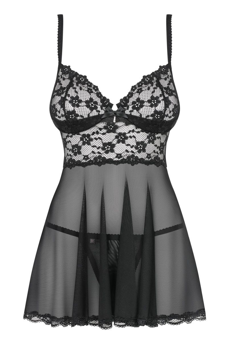 Эротичная сорочка в стиле бэби-долл из прозрачной вуали. Зона декольте изготовлена из кружева с цветочным узором. Чашечки на косточках с тонким поролоном снизу приподнимают грудь. Между ними украшение в виде атласного бантика и сверкающей подвески. Бретели сорочки регулируются по длине. Расклешенный подол декорирован кружевной оборкой. В комплекте: сорочка и трусики-стринги.