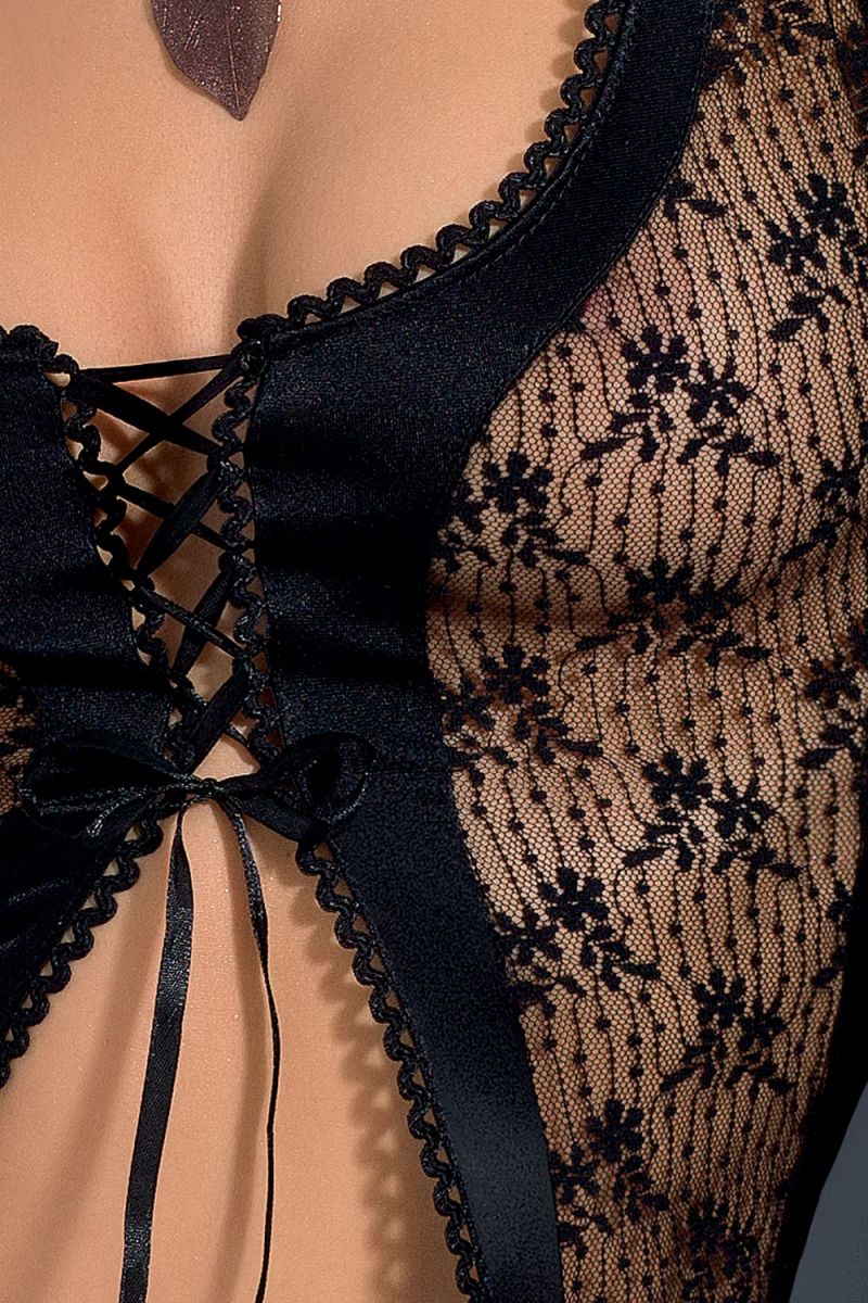 Элегантная сорочка из кружевного и стрейч-атласного материала, спереди на атласной шнуровке, в комплект входят трусики. В комплекте: сорочка, трусики-стринги.