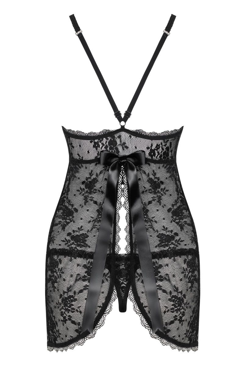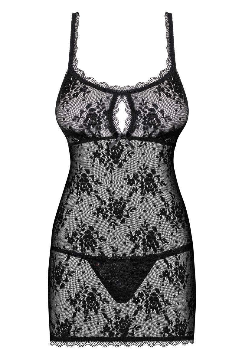 Соблазнительная сорочка Behindy выполнена из эластичного кружева. Отрезной мягкий лиф без косточек украшен каплевидным вырезом, бретельки регулируются. Сорочка слегка расклешенного кроя, сзади пикантный разрез с атласным бантиком. В комплекте: сорочка и трусики-стринги.