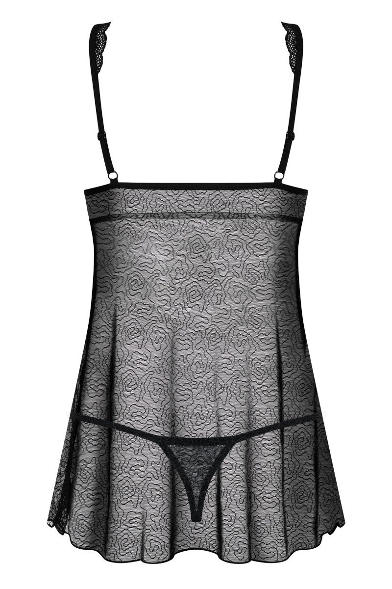 Полупрозрачный бэби-долл с рисунком и с открытым животом. Зону декольте украшает бантик из атласной ленты. В комплекте: беби-долл и трусики-стринги.