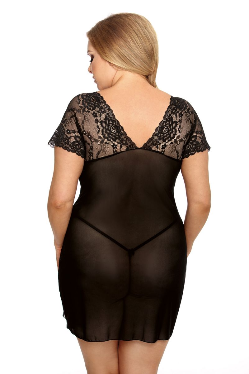 Короткая прозрачная сорочка со спадающим рукавом. Лиф декорирован кружевом. В комплекте: сорочка, трусики-стринги.