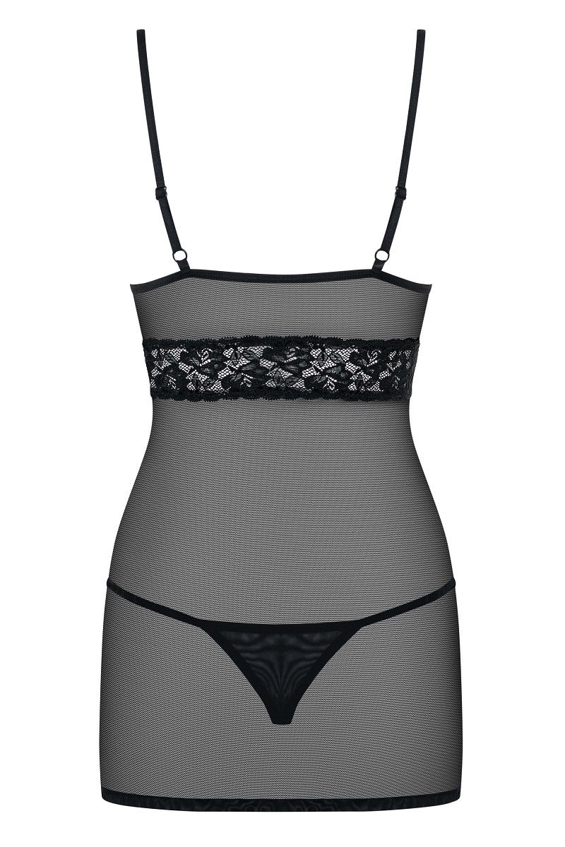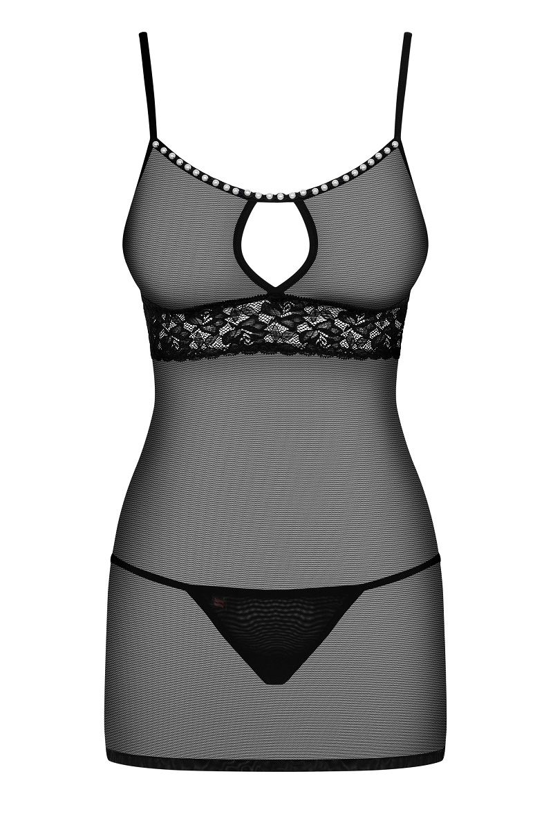 Полупрозрачная сорочка на тонких бретелях, зона декольте украшена маленькими жемчужинками. В комплект входят трусики. В комплекте: сорочка, трусики-стринги.