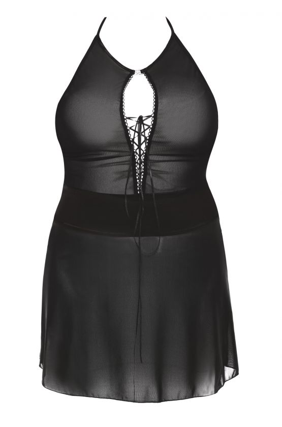 Прозрачная коротенькая сорочка с декоративной шнуровкой на груди. Сорочка имеет завязки на шее. В комплекте: сорочка, трусики-стринги.
