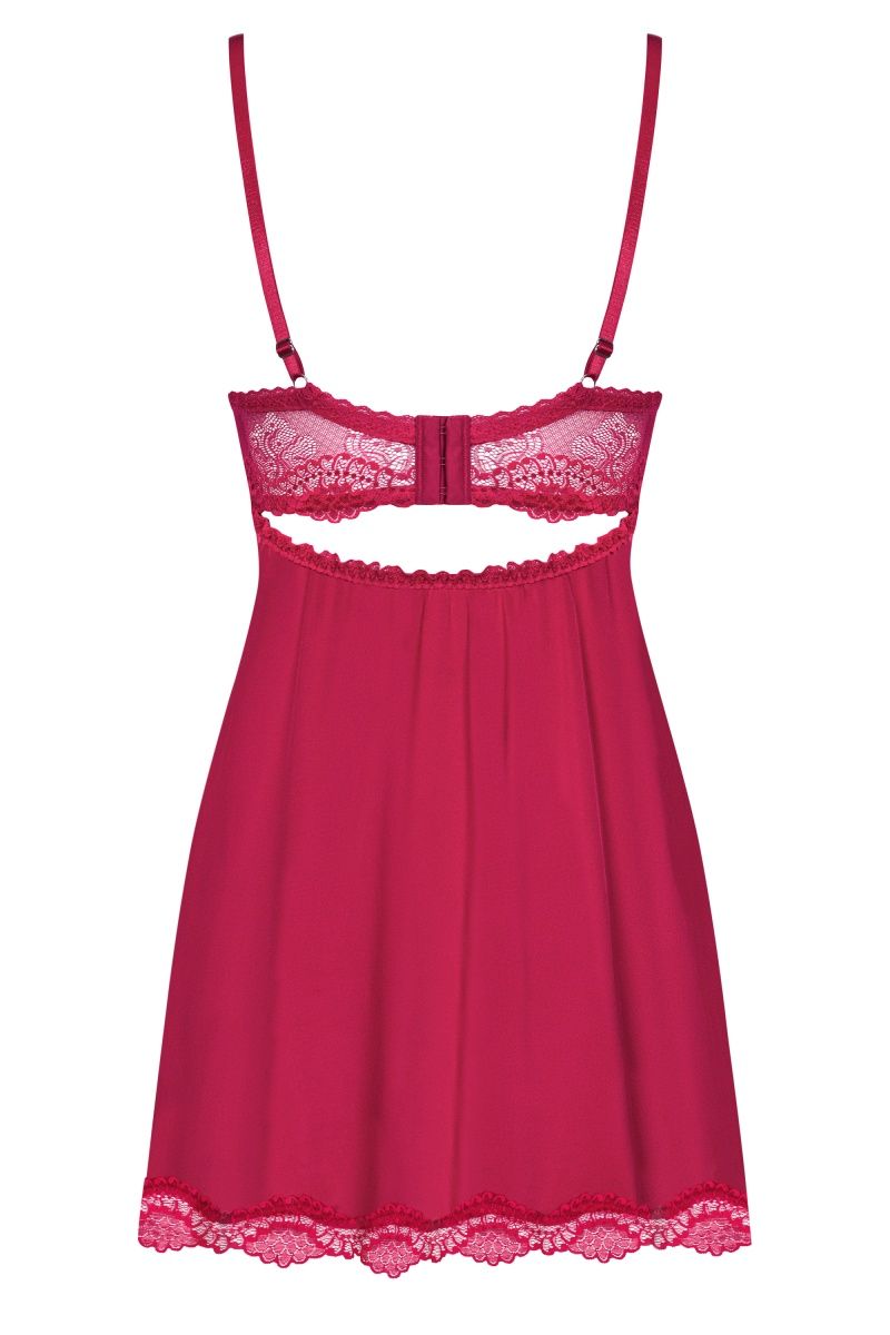 Сорочка для обладательниц пышного бюста. Чашечки на косточках с поролоном в нижней части поддерживают и приподнимают грудь. Узорчатое кружево вверху и под грудью украшает эту модель. Между чашечками красуется атласный бантик в тон. Сзади застежка на три ряда крючков для наилучшего прилегания. Бретели регулируются по длине. Кокетливый вырез на спинке расшит кружевной оборкой. Подол сорочки украшен кружевом. В комплекте: сорочка и трусики-стринги.