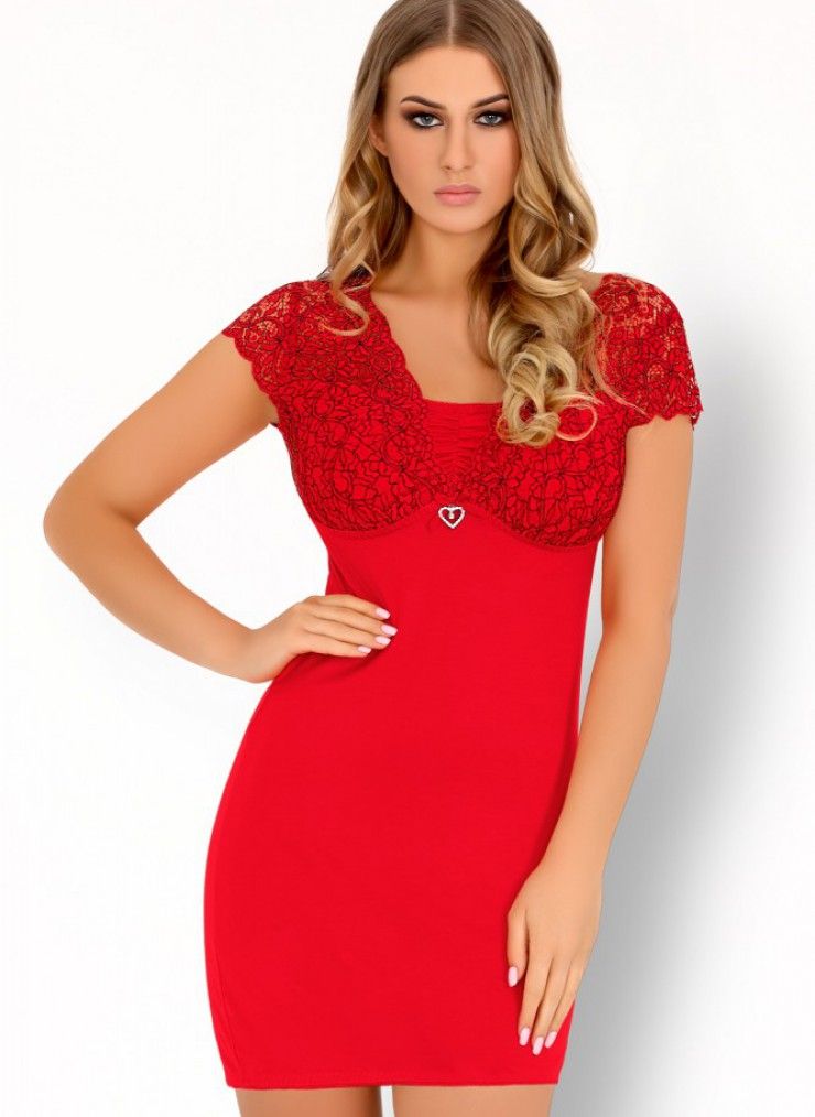 Короткая ночная сорочка облегающего покроя. Мягкие чашечки сорочки украшены узорчатым кружевом. В центре сверкающее украшение в форме сердечка. Короткие рукава также декорированы кружевом. Низ и спинка изделия изготовлены из гладкой однотонной ткани. В комплекте: сорочка и трусики-стринги.