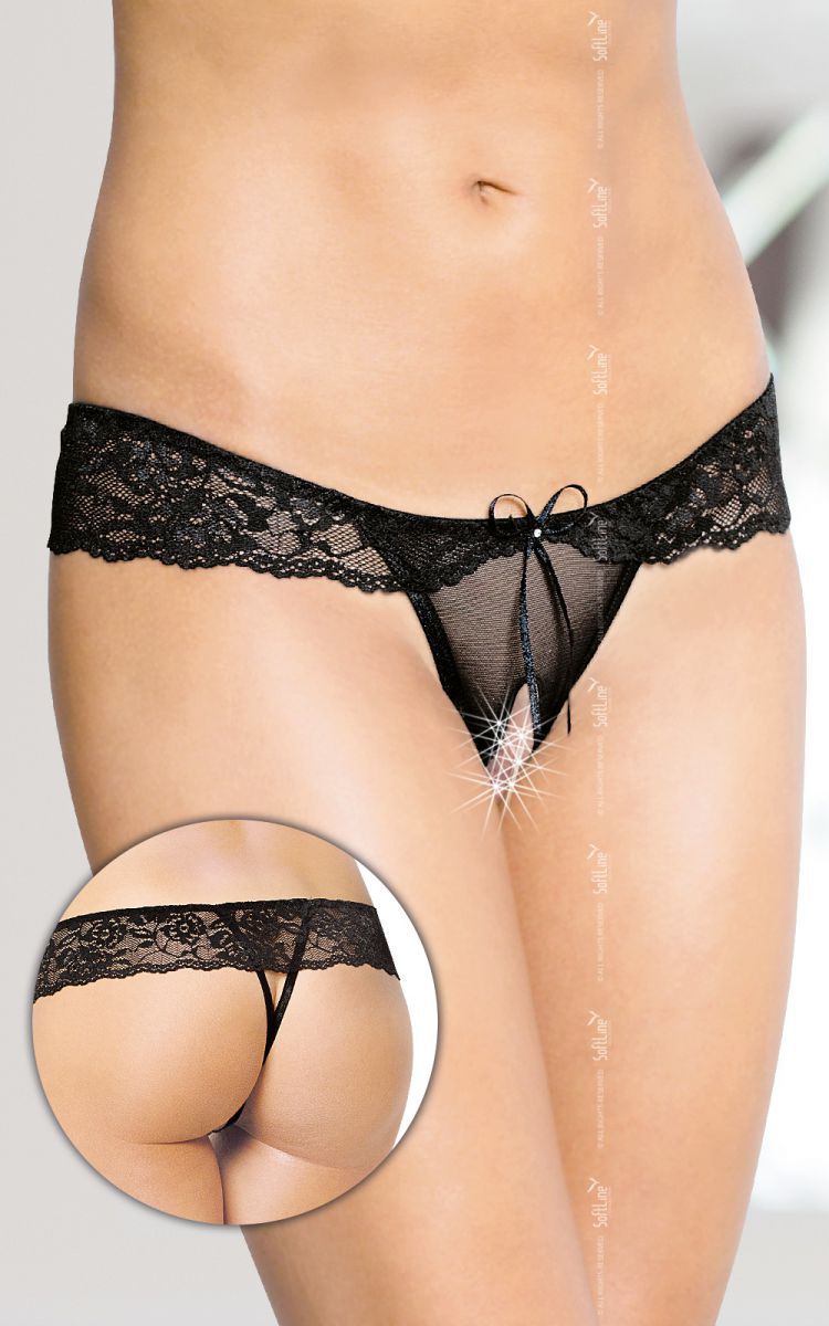 Плотно облегая бёдра, эти трусики-стринг с бантиком усилят вашу сексуальность. Выполненные из изысканного кружева с цветочным узором, они имеют интересную деталь. Под широким ажурным пояском скрывается горячий треугольник, лишь сверху прикрытый мелкой сеточкой. Именно поэтому женские прелести видны так, как если бы на вас не было белья вовсе.