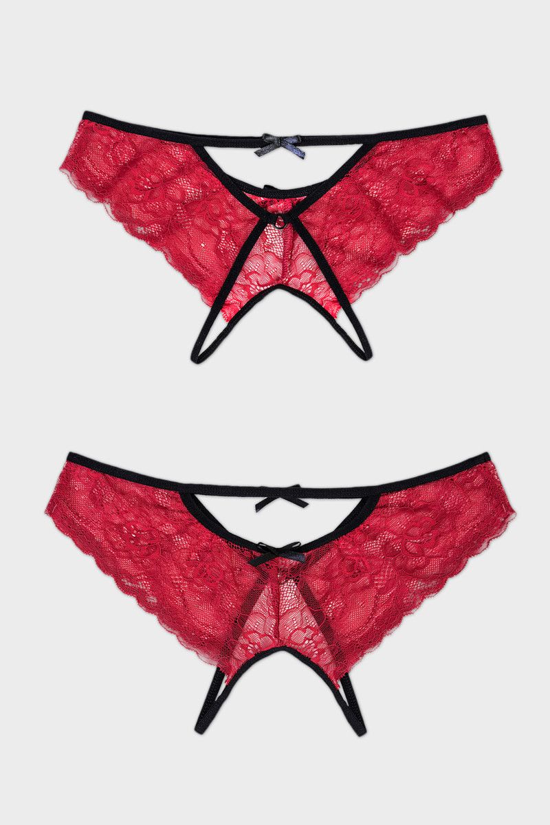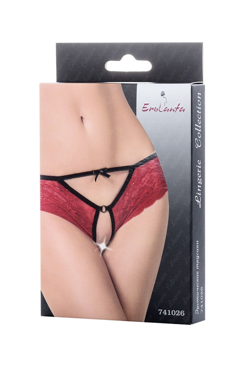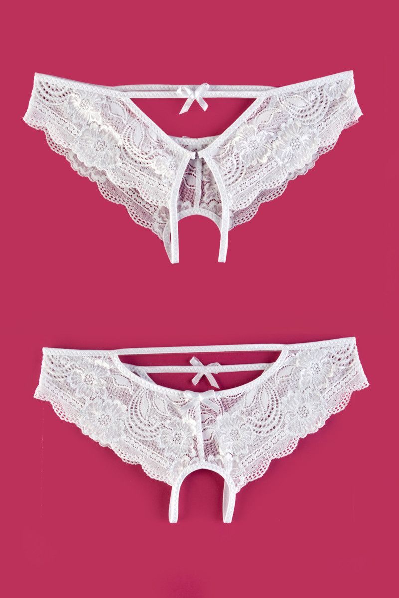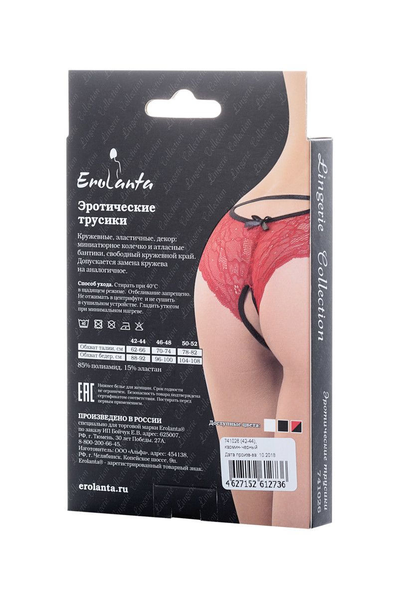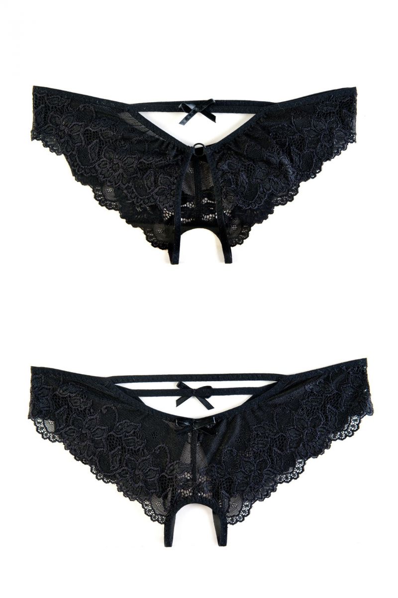 Эротические трусики из эластичного кружева, декорированные: миниатюрным колечком и атласными бантиками. Свободный кружевной край.
